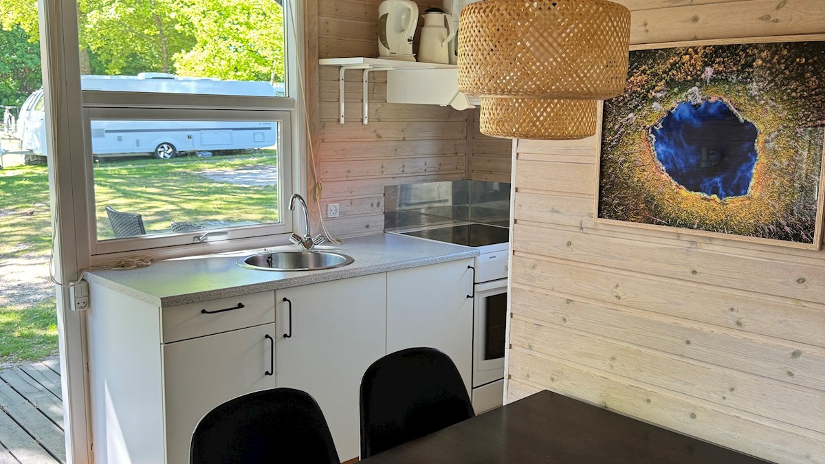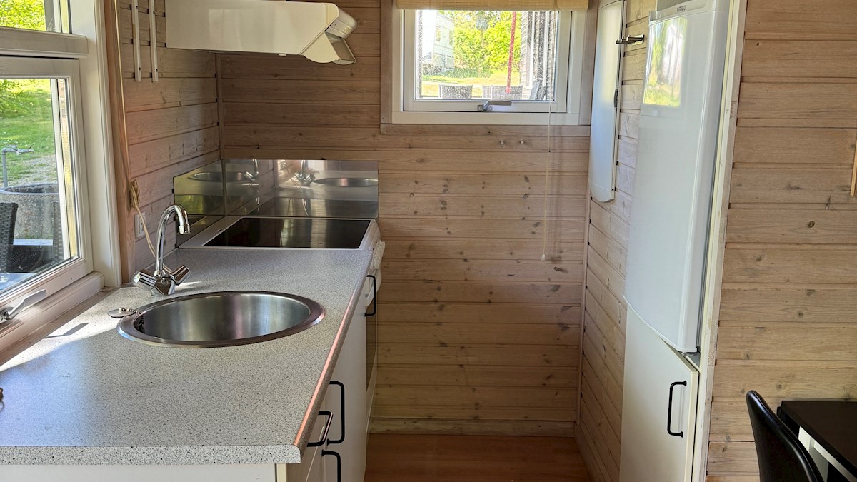 • Køkken med håndvask, køleskab, ovn, kogeplader, elkedel og kaffemaskine